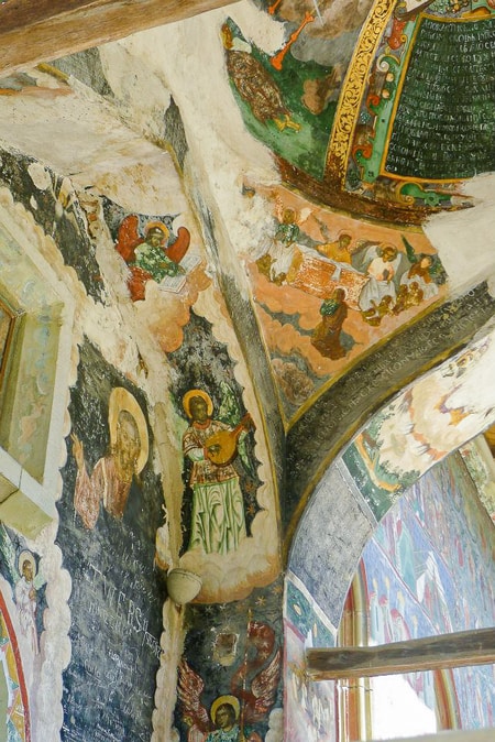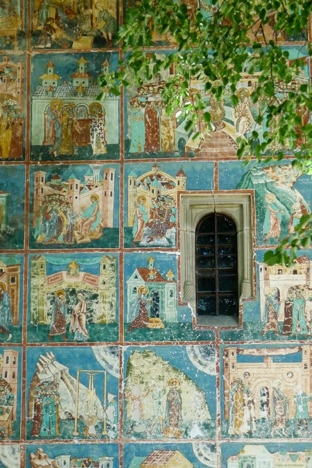 The monastery’s frescoes date back to 1601, which makes Sucevița the youngest of Moldavia’s painted churches. The frescoes illustrate a mix of themes from the Old and New Testaments.