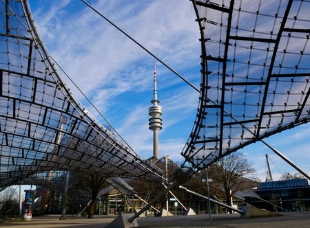 Olympiapark’s two famous landmarks are a 290m tower, and a warped athletic stadium.