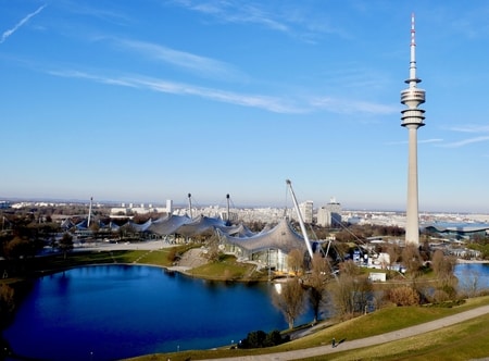 On clear sunny days, breathtaking views of Munich and the Alps extend in all directions from the Olympic Hill at the center of the park.